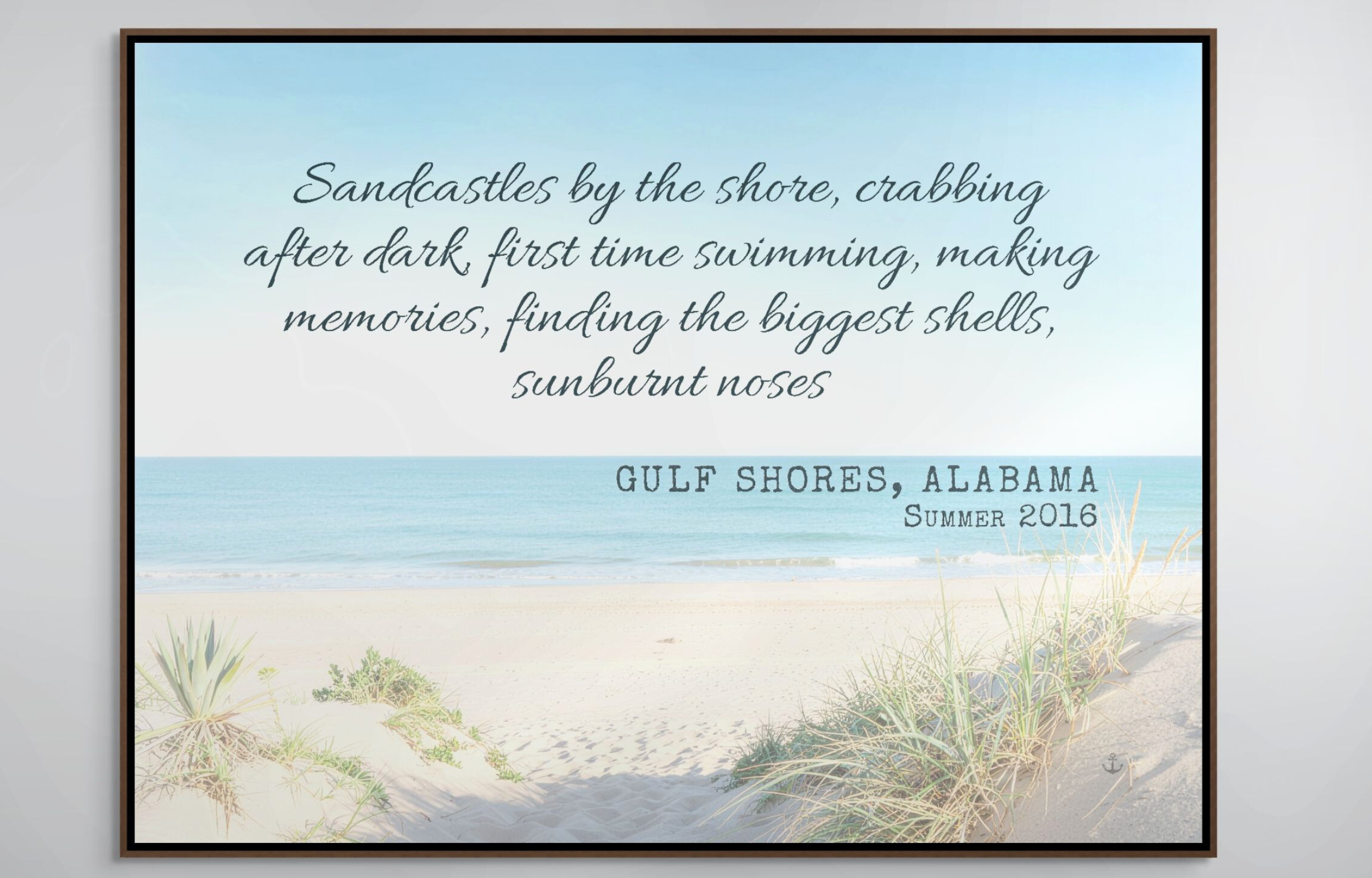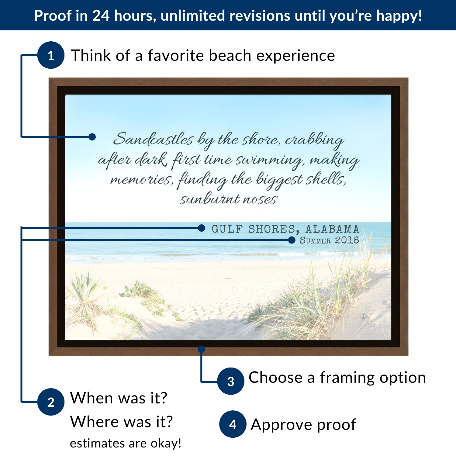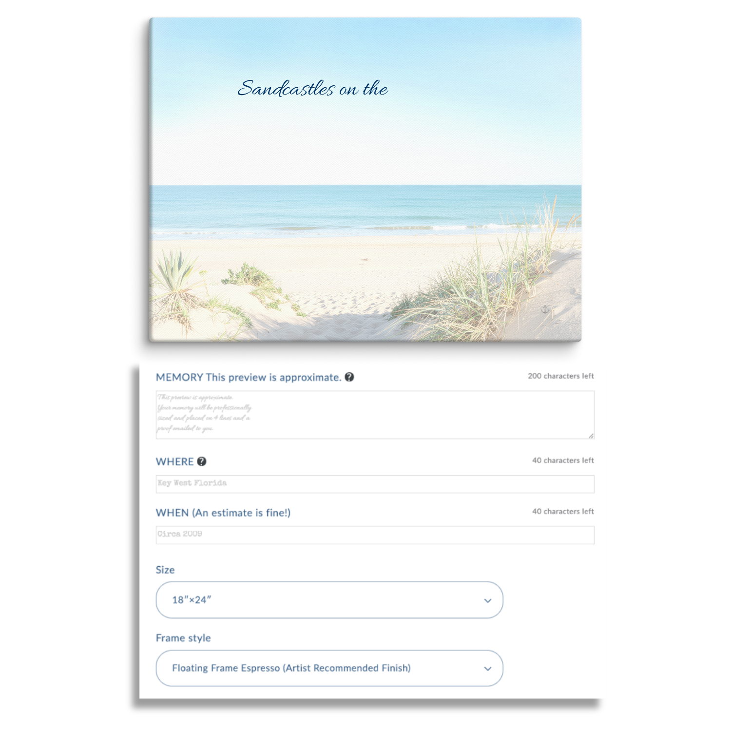 LIVE PREVIEW INSTANTLYType your memory, pick size/frame. See your warm beach memory on canvas instantly.