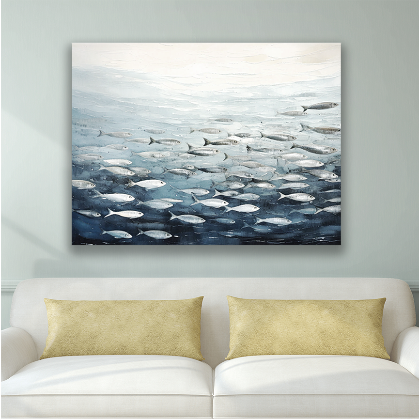 Underwater scene with a shimmering school of silver fish gliding in synchronized rhythm through layered blue-gray depths—this coastal art canvas captures that meditative moment of watching life move beneath the surface. The kind of coastal canvas art that makes stare-at-water people pause and get lost in the rhythm.
